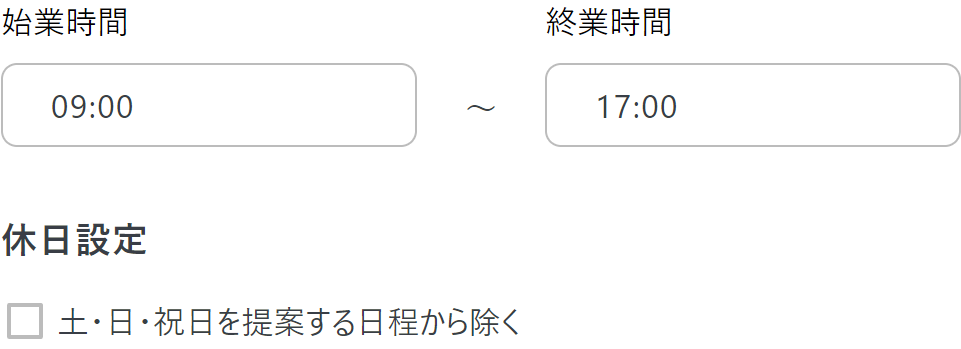 就業時間、休日を指定します。指定した就業時間、休日を考慮して空きスケジュールで日程調整用テキストが作成されます。